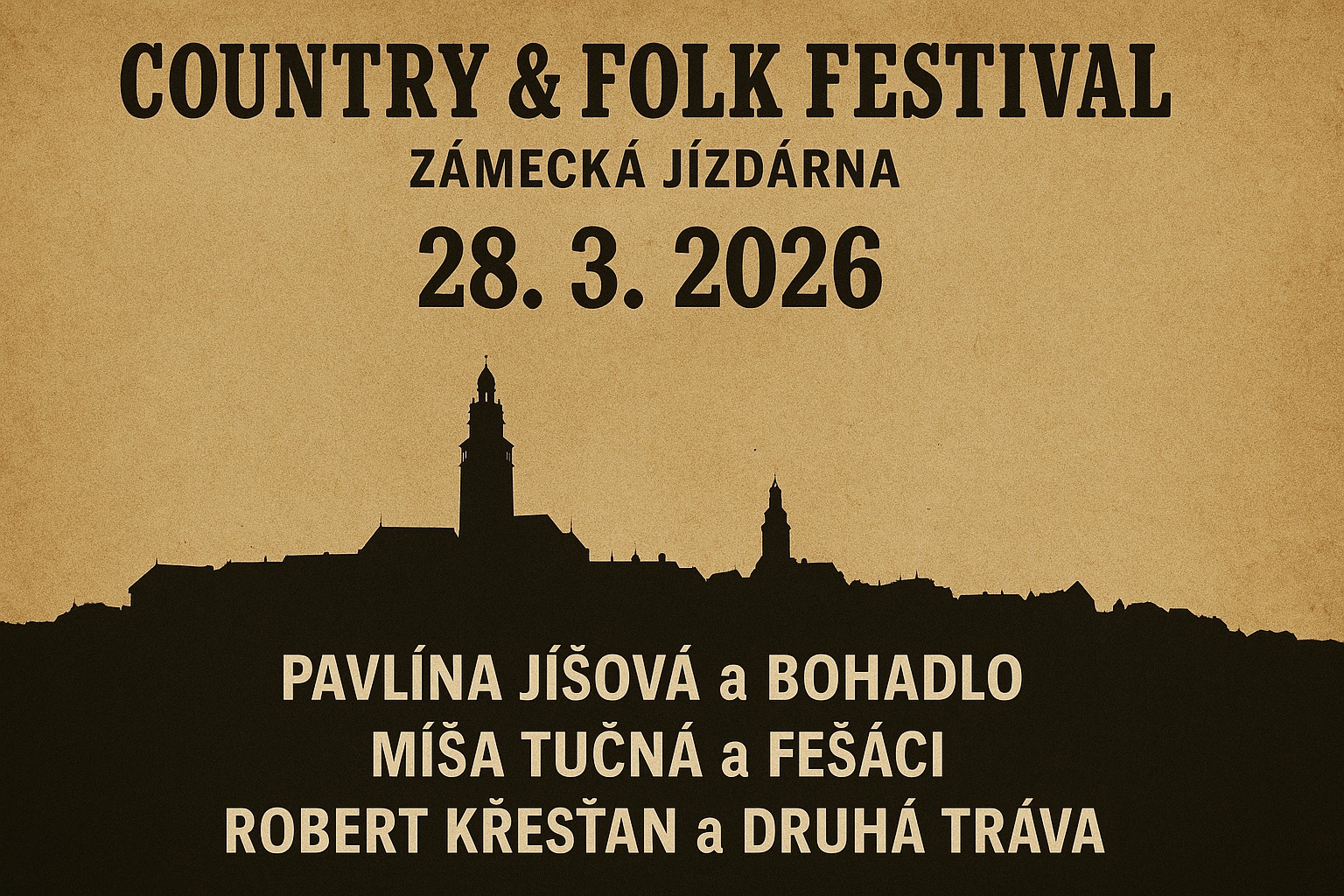 Folk a Country Festival na Zámecké jízdárně v Českém Krumlově. Můžete se těšit na odpoledne a večer plný folku a country s vystoupeními Pavlíny Jíšové a Bohadlo, Míši Tučné a Fešáků a Roberta Křesťana s kapelou Druhá tráva. K festivalové atmosféře přispěje nabídka krumlovského i plzeňského piva, grilovaných klobás a dalších lahůdek, které budou k dispozici na venkovní i vnitřní scéně.