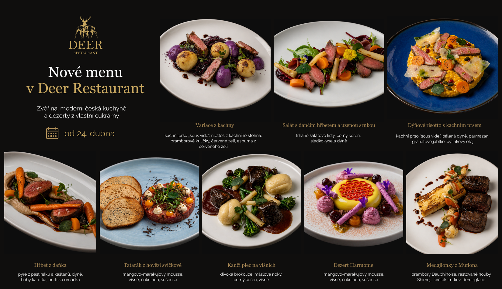 Deer Restaurant Prague otevírá novou kapitolu své kuchyně a představuje menu, které staví na zvěřině v moderním a lehčím pojetí. Těšit se můžete na promyšlené kombinace chutí – od kančí plece na višních po dýňové risotto s kachním prsem nebo jemné bezmasé varianty. Nechybí ani dezerty z vlastní cukrárny, včetně oblíbeného „Lesa“ nebo nové svěží „Harmonie“. Pro plnější zážitek je připravené degustační menu s vinným párováním.