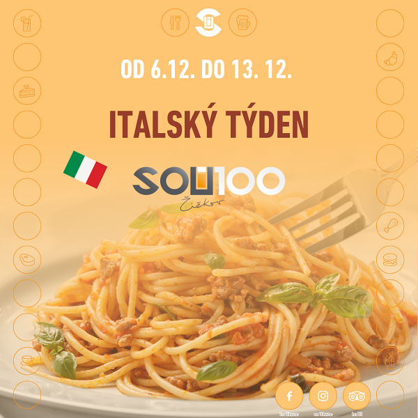 Restaurace SOLI100 na Žižkově připravila tematický Italský týden, během kterého bude možné ochutnat výběr tradičních i moderně pojatých pokrmů inspirovaných italskou kuchyní. V nabídce je například rajčatová polévka s parmazánem a bazalkou, krémové rizoto s houbami a grilovanou panenkou nebo tagliatelle s krevetami, chilli a česnekem na bílém víně. Nechybí ani klasické tiramisu s mascarpone nebo dušené hovězí po italsku s olivami a sušenými rajčaty. Celé menu je dostupné pouze po omezenou dobu.