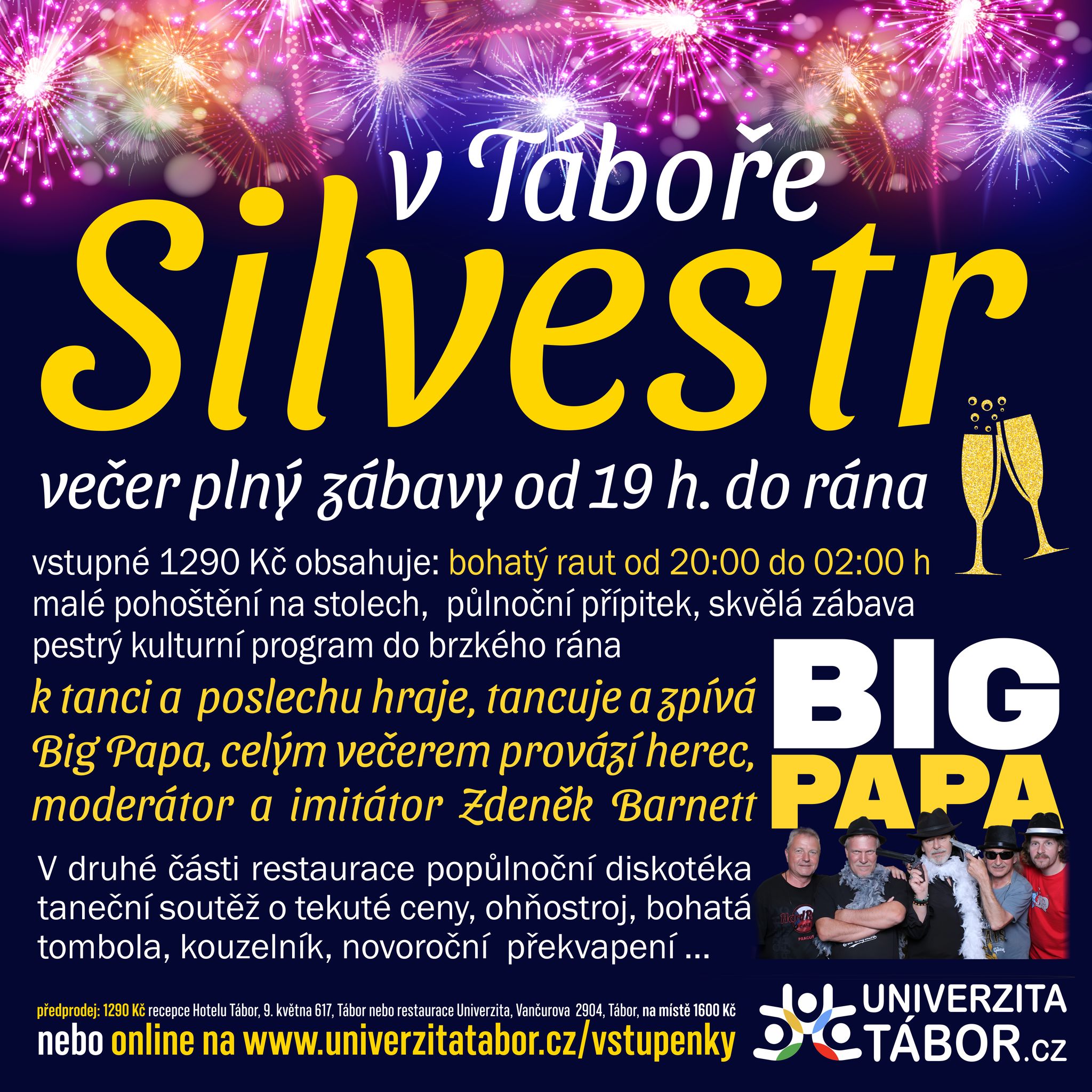 Těšte se na silvestrovský večer, který nabídne bohatý raut, občerstvení na stolech, půlnoční přípitek i pestrý kulturní program hned od začátku. Chybět nebude spousta zábavy, tance a radosti. K poslechu i tanci hraje, zpívá a tančí Big Papa a večerem provází herec a imitátor Zdeněk Barnett. Po půlnoci vás čeká diskotéka, taneční soutěže, ohňostroj a bohatá tombola.