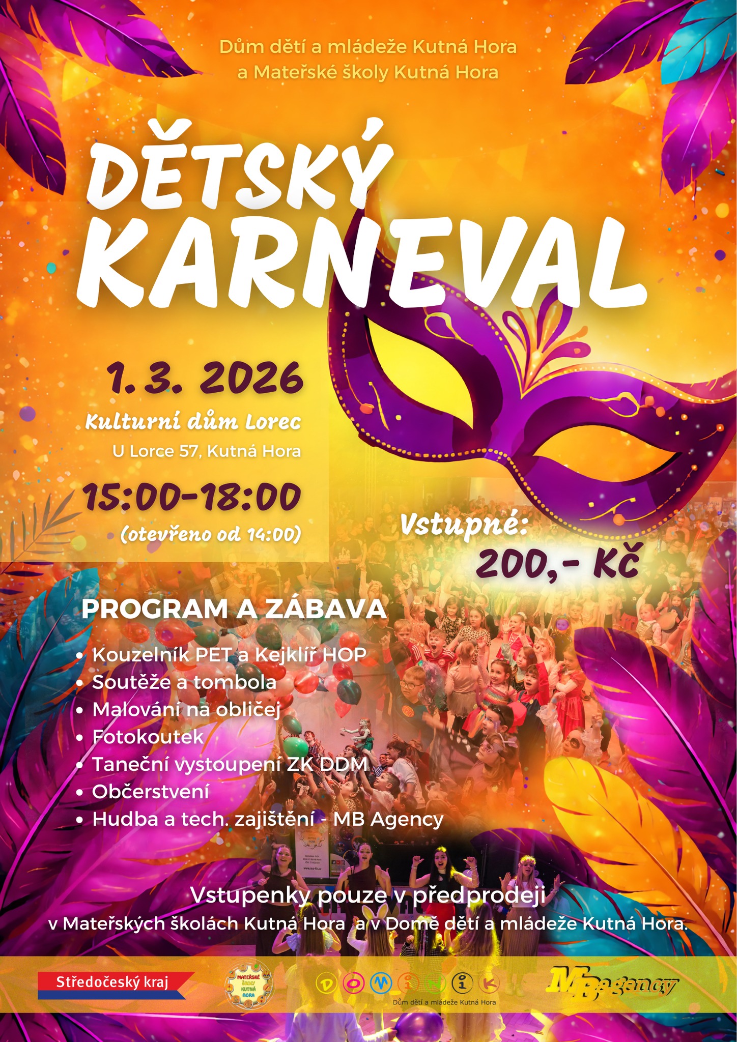 Dům dětí a mládeže Kutná Hora společně s mateřskými školami připravují druhý ročník oblíbeného Dětského karnevalu. Návštěvníky čeká bohatý program včetně kouzelníka PETa, kejklíře HOPA, soutěží, her, tance, malování na obličej, bublinkové show, fotokoutku a vystoupení tanečních kroužků DDM. Pro účastníky je připravena také tombola.