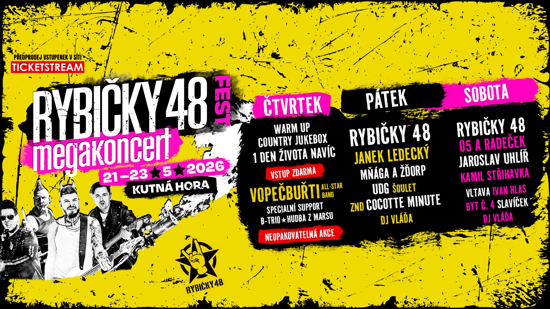 Tři dny plné hudby, energie a nezapomenutelné atmosféry – Megakoncerty v Kutné Hoře jsou zpět a letos naposledy. Ve výjimečném areálu vás čekají dvě pódia a to nejlepší z české hudební scény. Vrcholným momentem bude speciální vystoupení kapely Rybičky 48, která odehraje svůj nejdelší koncertní set s unikátní show, jakou jinde neuvidíte. Těšit se ale můžete na celou řadu dalších hudebních zážitků. Počítejte ale s tím, že akce bývá pravidelně vyprodaná – vyplatí se zajistit si vstupenky včas.