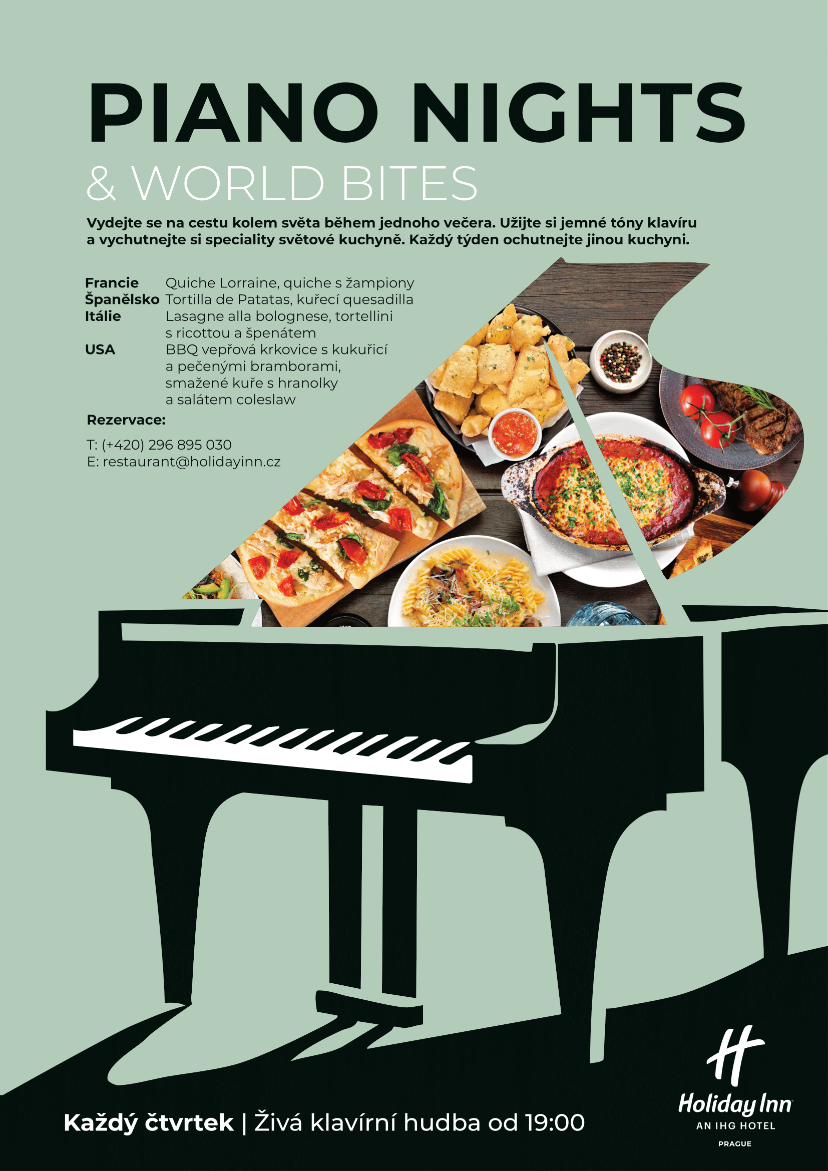 Každý čtvrtek se v prostorách Holiday Inn Prague rozezní jemné tóny klavíru a zároveň se servírují speciality světové kuchyně. Během jednoho večera se tak vydáte na kulinářskou cestu napříč kontinenty – ochutnáte například francouzský quiche, španělské tortilly a quesadilly, italské lasagne nebo americkou BBQ krkovici s typickými přílohami. Atmosféru dokreslí živá klavírní hudba, která začíná vždy v 19 hodin. Nabídka se pravidelně obměňuje podle země, na kterou je daný večer zaměřen.