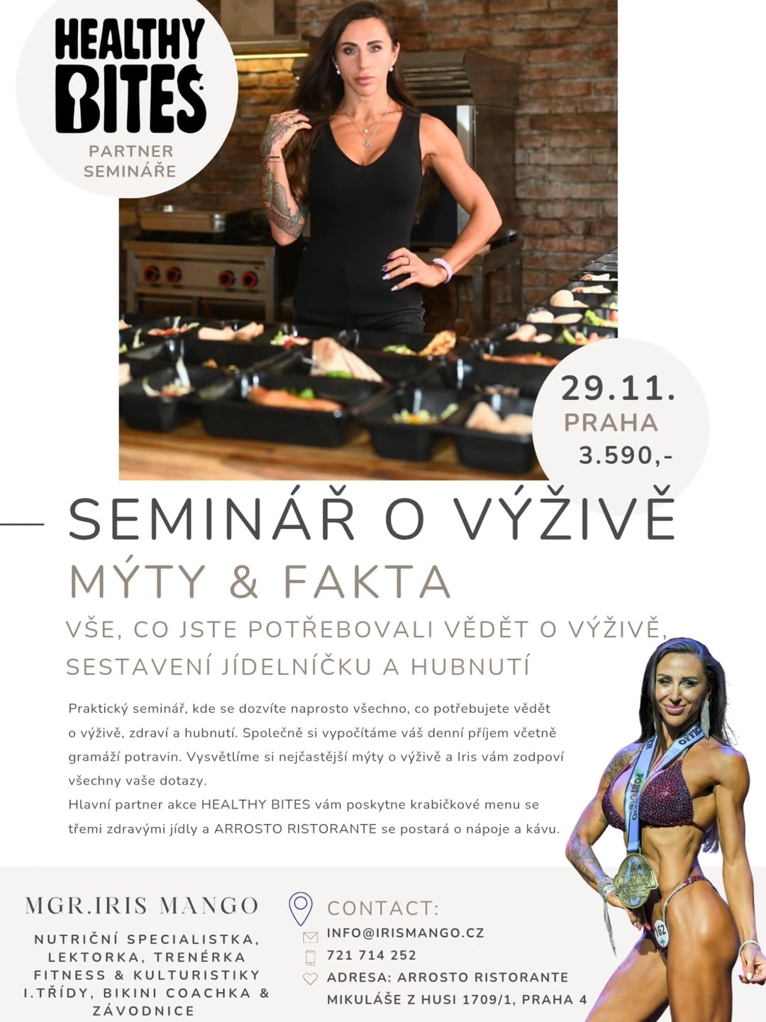 Celodenní seminář pod vedením nutriční specialistky Iris Mango nabídne ucelený pohled na výživu, sestavování jídelníčku a zdravé hubnutí. Účastníci se naučí vypočítat svůj denní příjem včetně přesných gramáží potravin, zjistí, jaké výživové mýty jsou běžně rozšířené, a získají prostor na vlastní dotazy. V ceně semináře je zahrnuto občerstvení v podobě tří zdravých jídel od HEALTHY BITES – svačina z programu Bikini Fitness, oběd dle preferencí (maso, ryba nebo vegetariánská varianta) a sladký či slaný snack. O nápoje a kávu se postará restaurace Arrostro Ristorante, kde se celá akce koná.