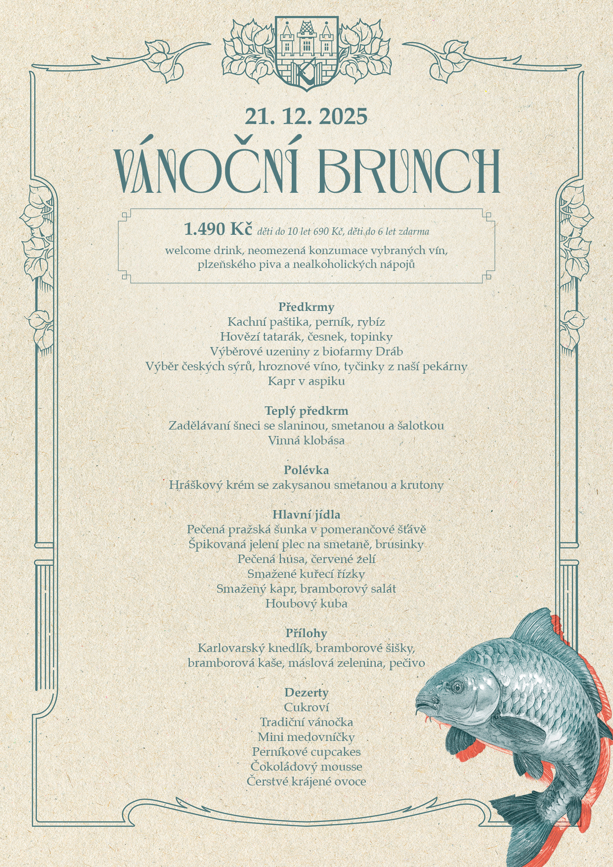 Šéfkuchař Lubomír Dolejš letos vsadil na tradiční české recepty v moderním pojetí, takže se můžete těšit na pokrmy, které připomenou domov i dětství, jen v promyšlenější a elegantnější podobě. Začnete houbovým kubou s krůtí rolkou a kaštany, následuje rybí polévka se zeleninou, bylinkami a vaječným svitkem. Hlavní chod nabízí dvě varianty – smaženého kapra s bramborovým pyré, marinovanou zeleninou a limetkovou majonézou, nebo telecí řízek s domácím bramborovým salátem. Na závěr vás čeká cheesecake z karamelizovaných pomerančů s čokoládovým krémem a perníkovým prachem. Restaurace během prosince láká i na sváteční atmosféru se zlatavým světlem a poklidným servisem.