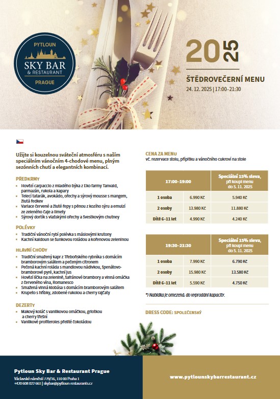 Prožijte Štědrý večer 24. prosince 2025 ve výjimečné atmosféře Pytloun Sky Baru s výhledem na Prahu. Čeká vás čtyřchodové vánoční menu, které spojuje sezónní chutě s elegancí moderní gastronomie.