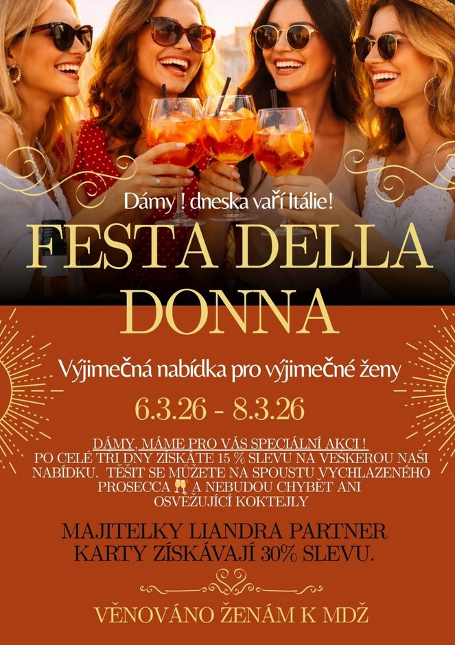 Chcete oslavit Mezinárodní den žen s příjemným večerem a osvěžujícími nápoji? Přijďte do Liandry a užijte si speciální akci věnovanou ženám. Po celé tři dny získáte 15 % slevu na veškerou nabídku, připravena je spousta vychlazeného prosecca a osvěžujících koktejlů.
