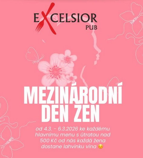 Chcete si udělat příjemný večer u dobrého jídla a oslavit Mezinárodní den žen s přáteli? V Excelsior Pub pro vás připravili speciální akci, během které každá žena při objednávce hlavního jídla s útratou nad 500 Kč získá lahev vína jako dárek.
