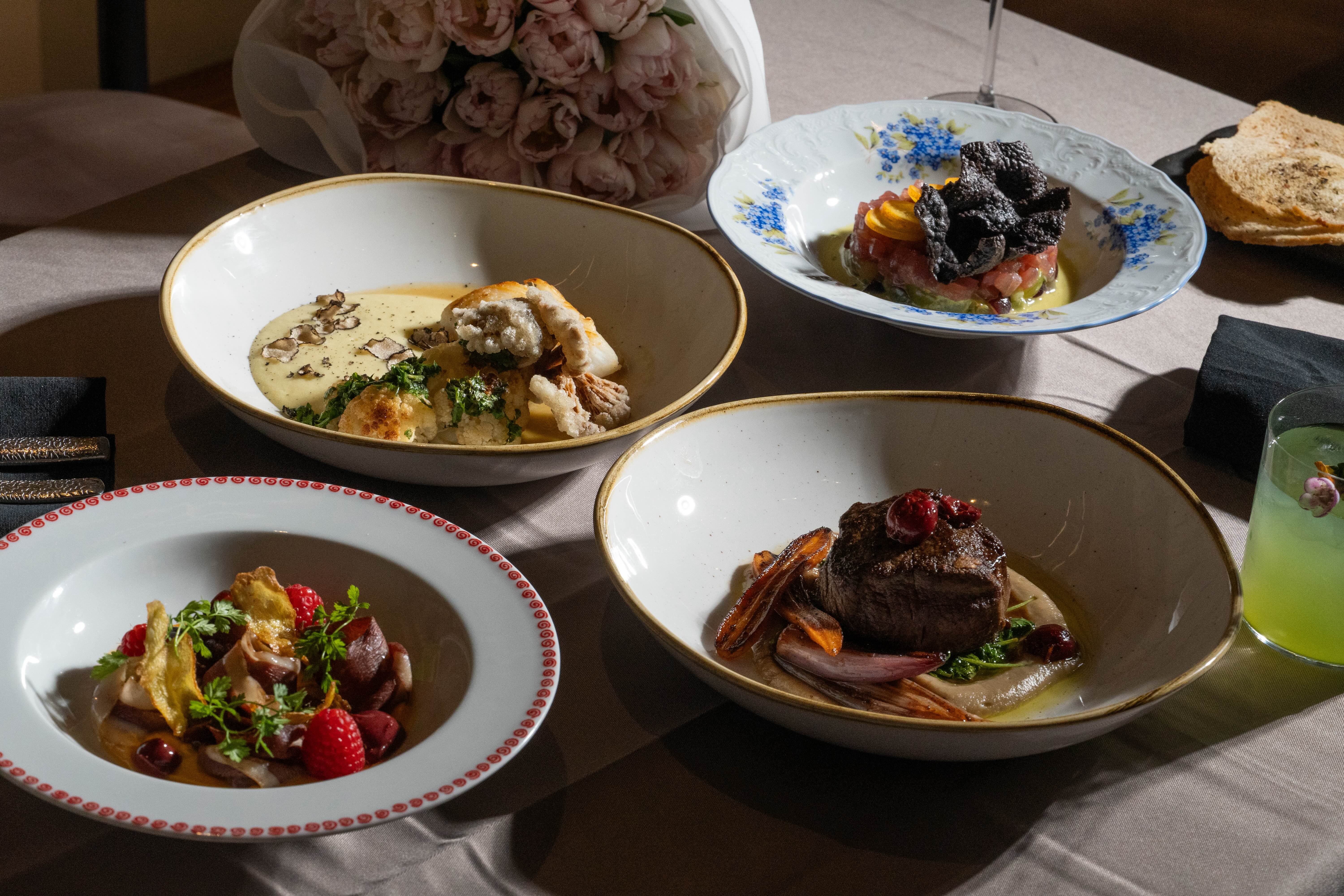 Hlavní chod: Restovaný halibut na másle s bramborovou espumou s lanýžem, opečeným květákem s petrželovou gremolatou a beurre blanc Chardonnay nebo Steak z dančího hřbetu s topinamburovým pyré, restovaným kadeřávkem, glazovanou šalotkou a mrkví, zvěřinový jus na červeném víně s višněmi