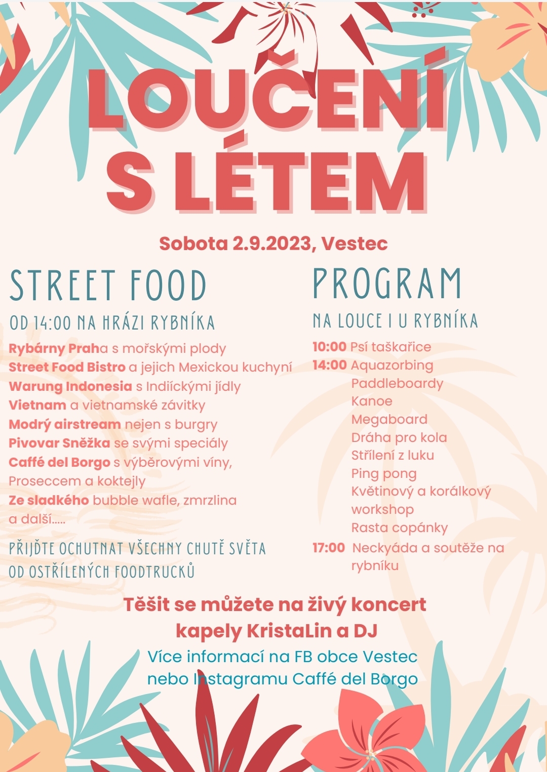 V obci Vestec se chystá skvělá akce u rybníka – Loučení s létem. Návštěvníci mohou očekávat pestrý program plný lahůdek. Bude zde přítomna Rybárna Praha s mořskými specialitami, Street Food Bistro s chutěmi Mexika a Warung Indonesia s autentickými indickými pokrmy. Pro milovníky asijských chutí jsou připraveny tradiční vietnamské závitky. Burgery a další pochoutky představí Modrý airstream. Pivovar Sněžka ukáže své unikátní pivní speciality, zatímco Caffé del Borgo nabídne výběrová vína, osvěžující Prosecco a koktejly. Milovníky sladkého potěší stanoviště s bubble wafle a zmrzlinou. Je to skvělá příležitost prožít nezapomenutelný den v krásném prostředí obce Vestec.