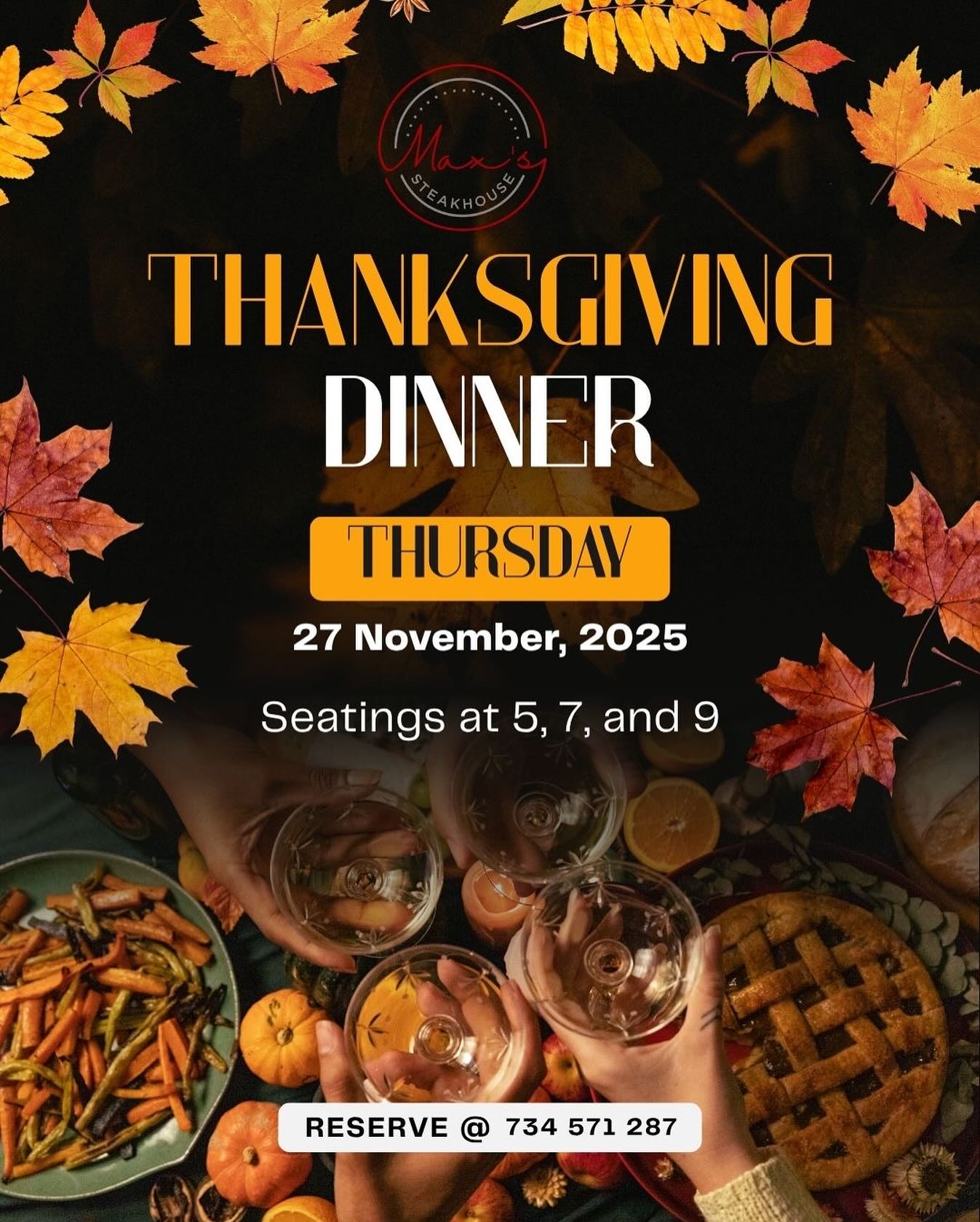 Max’s Steakhouse chystá už 15. ročník slavnostní večeře ke Dni díkůvzdání. Těšit se můžete na tříchodové menu servírované na bílém ubruse: kukuřičnou polévku, šťavnatou krůtu (bílou i tmavou), domácí nádivku, omáčku, brusinkový přeliv, bramborovou kaši a medem glazovanou šunku. Na závěr nechybí jejich proslulý dýňový koláč. Cena je 950 Kč, při rezervaci se skládá záloha 200 Kč. Počet míst je omezený, proto je lepší rezervovat co nejdříve. Usadí vás v časech 17:00, 19:00 nebo 21:00.