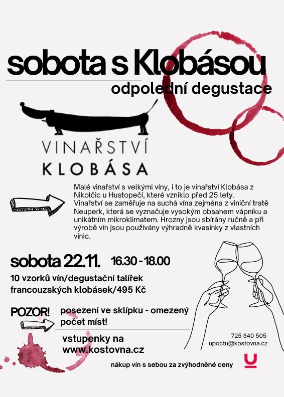 Zažijte výjimečné sobotní odpoledne s vinařem Klobásou z Nikolčic u Hustopečí a ochutnejte 10 vzorků vín z jeho malého, ale uznávaného vinařství. Degustace proběhne výjimečně v sedě, u společné tabule, a doprovodí ji degustační talířek francouzských klobásek, bagetky a kváskový chléb. Vinařství Klobása se zaměřuje na suchá vína, vyráběná s respektem k půdě, mikroklimatu i tradici.