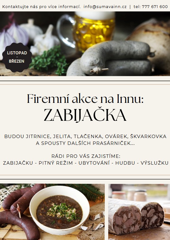 Šumava Inn nabízí také možnost uspořádání firemních akcí či skupinových setkání. Oblíbenou specialitou je tradiční šumavská zabijačka, kterou si můžete užít se svým týmem v autentické atmosféře.
